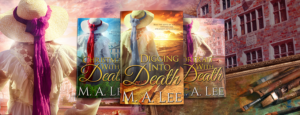 The cover for the collection Sailing with Mystery echoes the covers for the original three-book series Into Death. The ocean and the railing of the ship depict her location while the tumultuous sky echoes the mysteries she encounters while aboard the passenger ship.